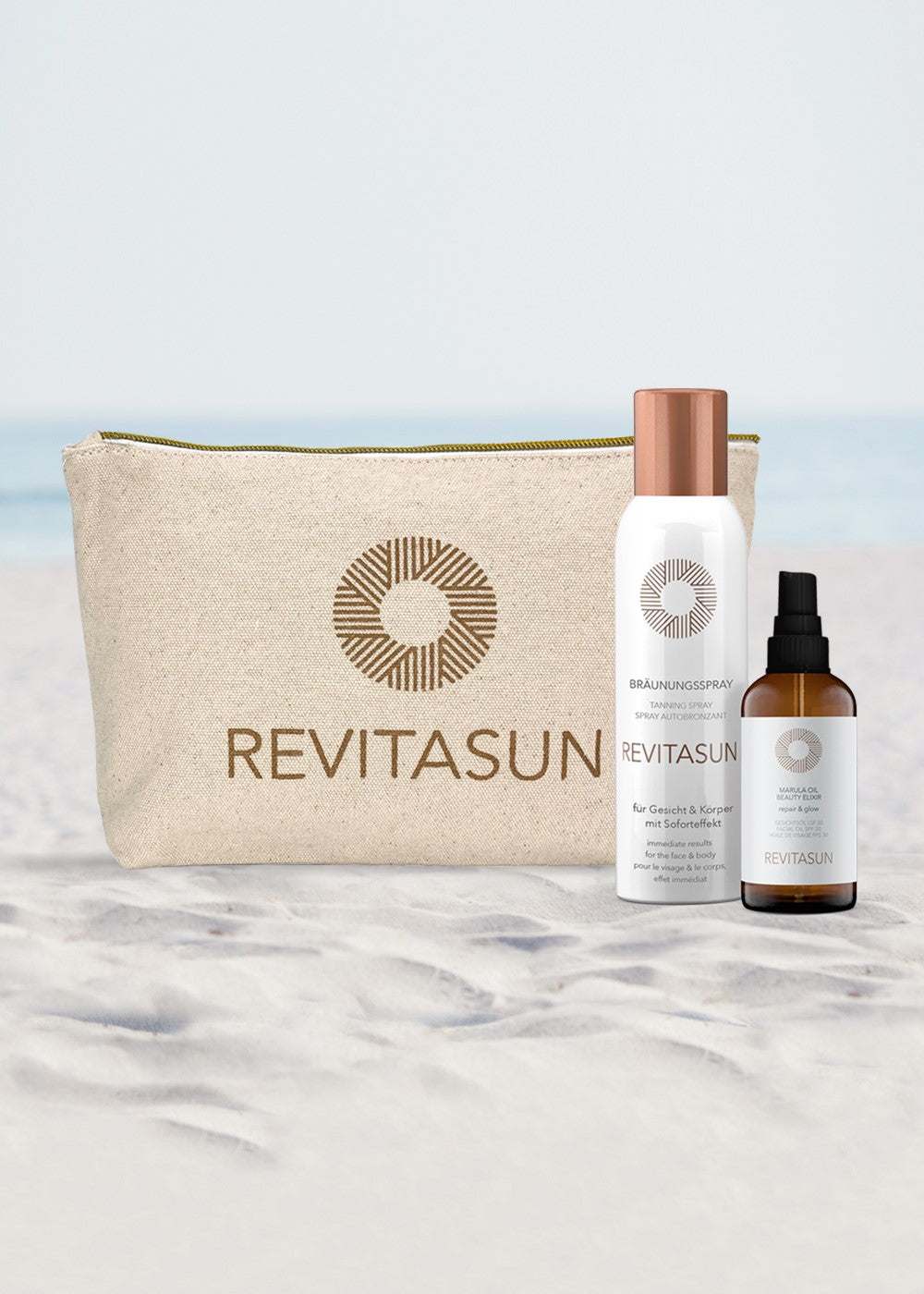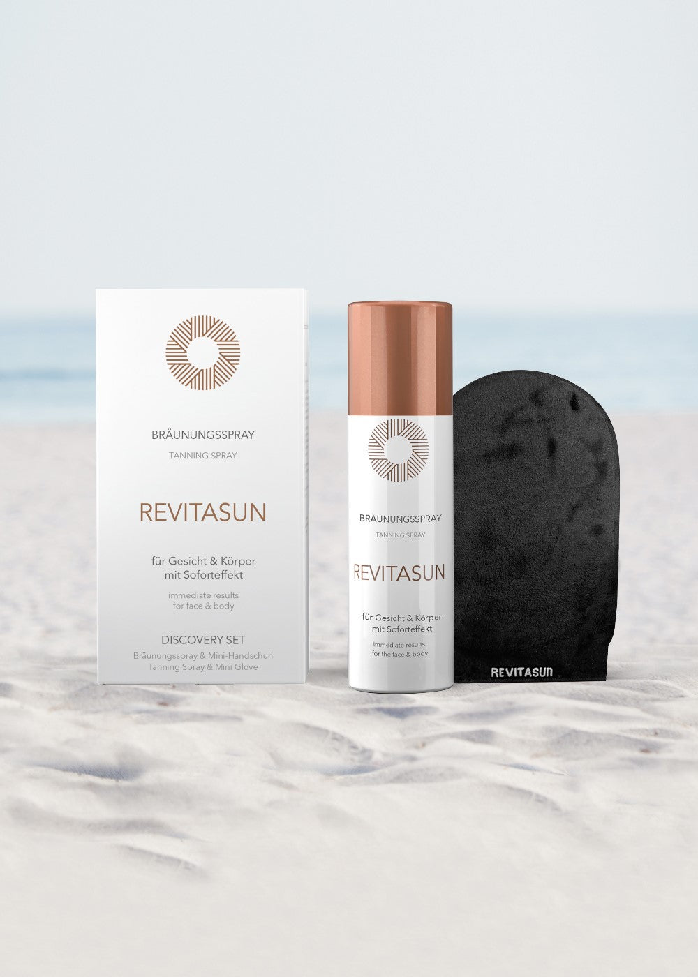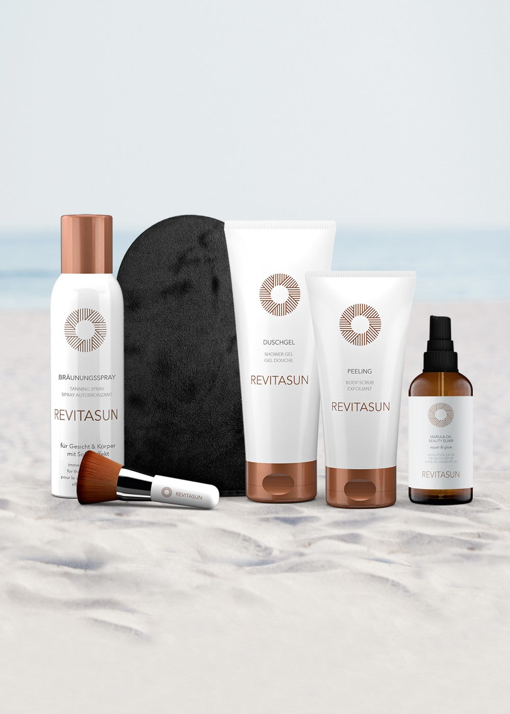 Our REVITASUN products include a tanning spray for easy use. A specialized flat kabuki brush and tanning glove for even application. A nourishing body scrub, shower gel, and lotion to help support the skin’s natural regeneration process. So you can get the best out of your tan.